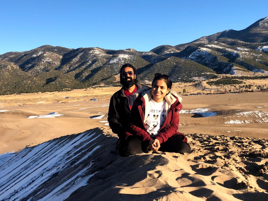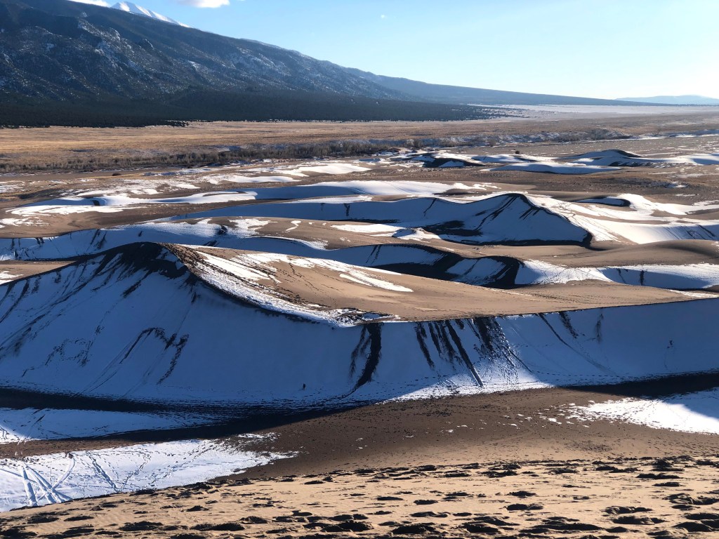 Hiking in this National Park is an experience in itself. There is no designated “path” to hike on, but endless dunes to climb onto. The higher you can climb onto the dune, the better vantage point for you. But do carry water and a hat since it can get tiresome fast! We were lucky to go just after a mild snow shower from the previous night which gave us a perfect mix of white and brown. We parked at the first available parking right after the visitor’s center and just explored the sand dunes by foot to few of the visibly high sand dunes we could see.